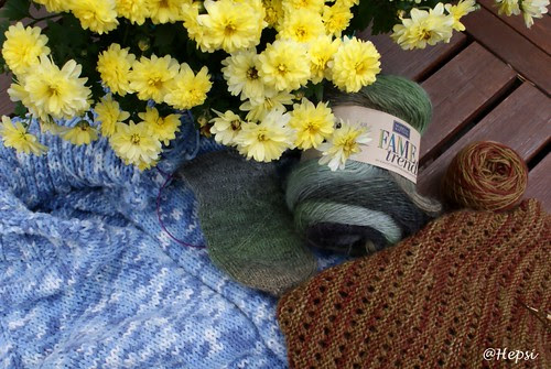 Mitään uutta ei ole valmistunut ja vanhatkin ovat edistyneet verkkaisesti. Toisaalta yhtään uutta työtä en ole aloittanutkaan, joten kesken on edelleen vain kolme neulomusta.